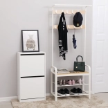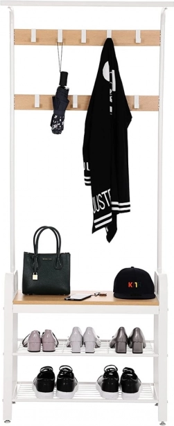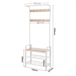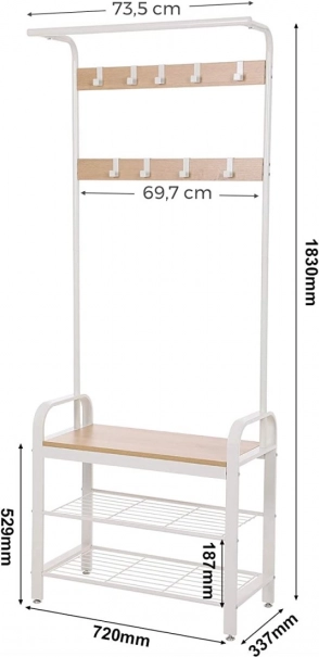Un totale di 9 ganci in due file consente di appendere vari tipi di abiti e accessori. Inoltre, è disponibile un'asta per appendere sciarpe e foulard. Sotto l'appendiabiti sono posizionati due ampi scaffali per scarpe, che mantengono le tue calzature organizzate. Al contempo, il sedile offre comodità nel mettere le scarpe.