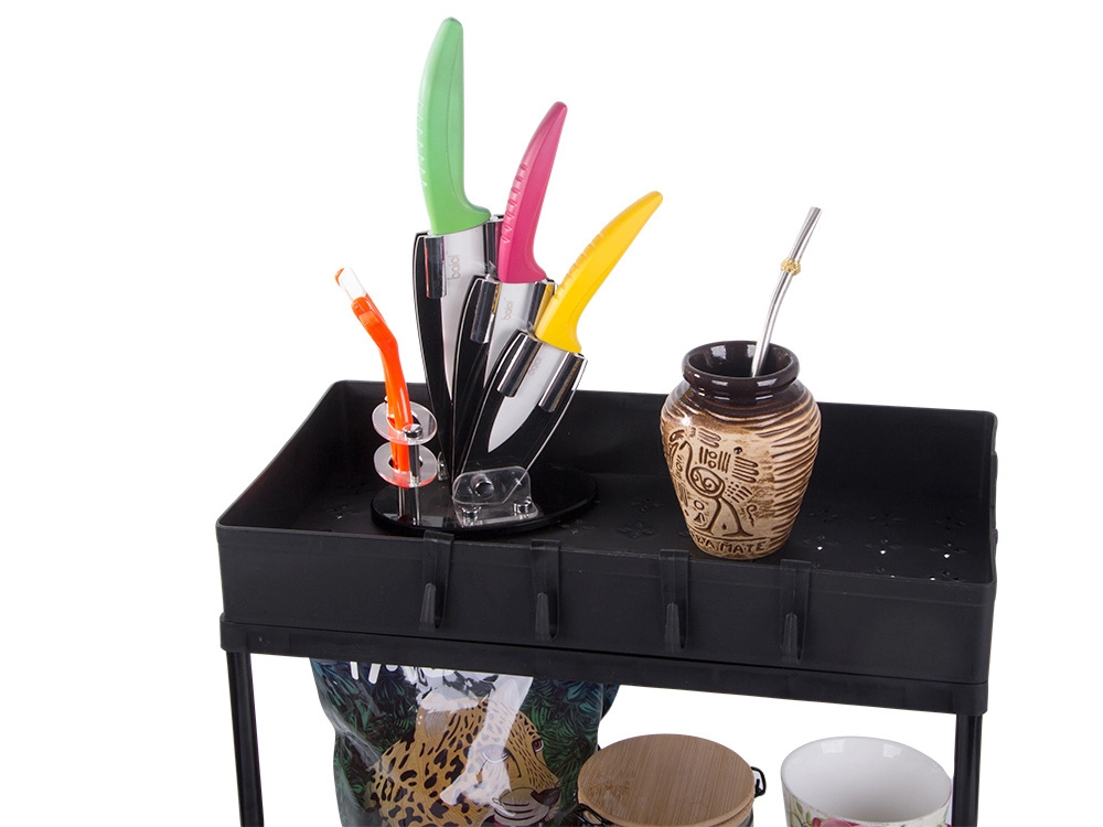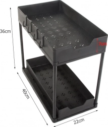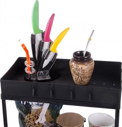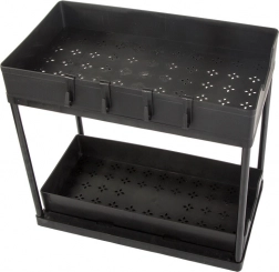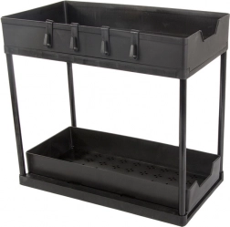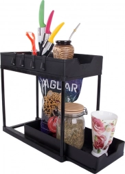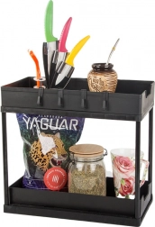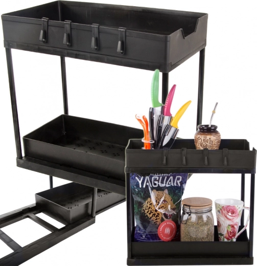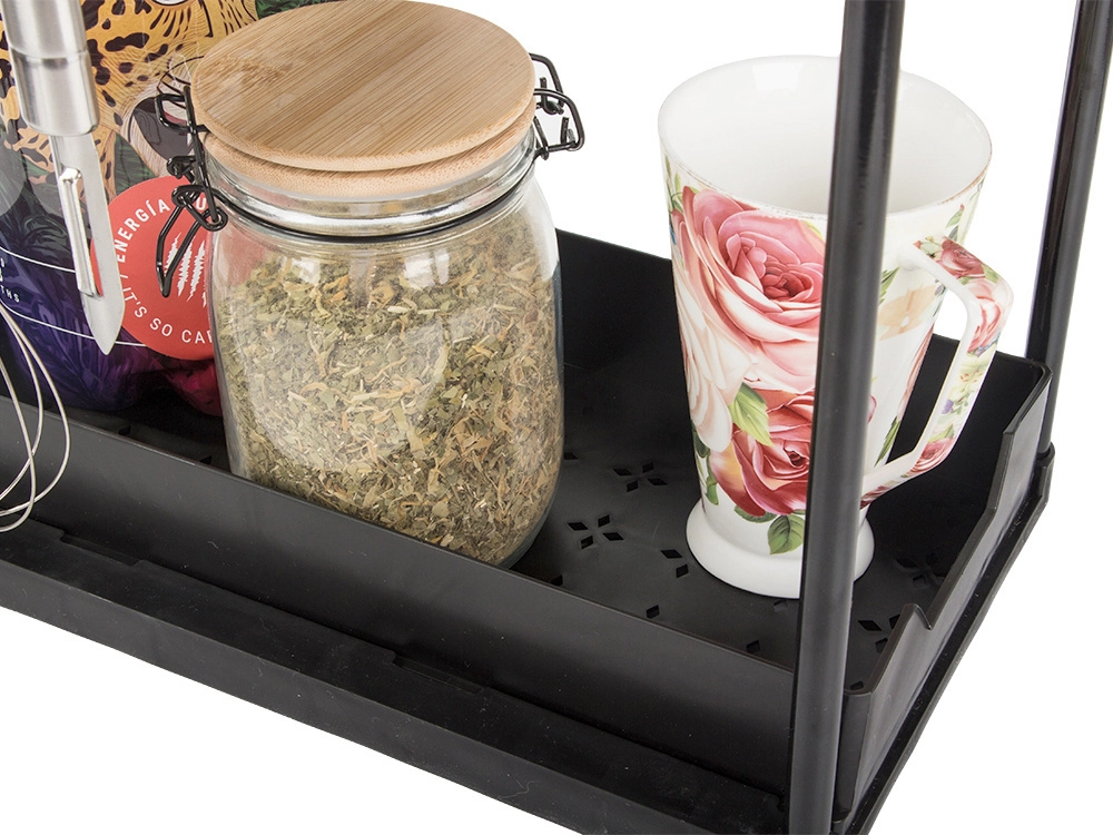 Questo portaspezie multifunzione offre una pratica organizzazione a due livelli con estrazione, che garantisce ordine e accesso rapido agli oggetti riposti. Quattro ganci pratici sul frontale sono perfetti per fruste, cucchiai o strofinacci. Il design minimalista in colore nero si adatta perfettamente sia agli interni moderni che a quelli tradizionali.