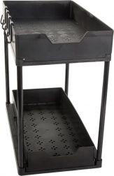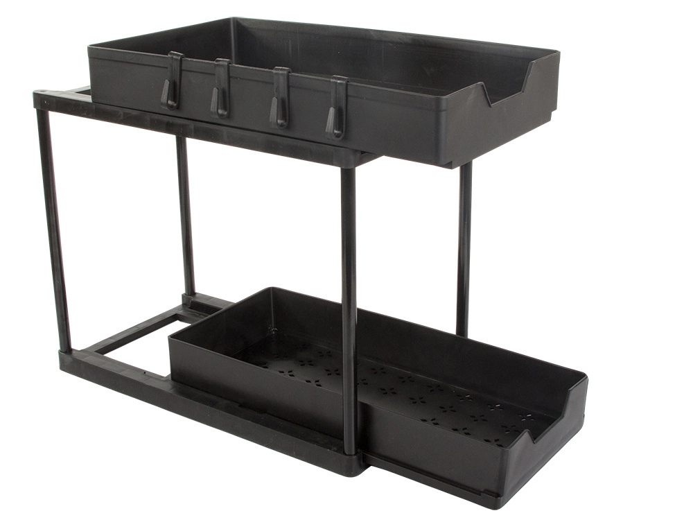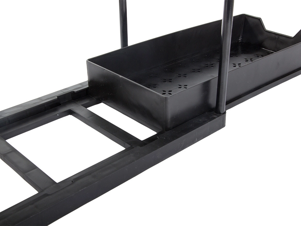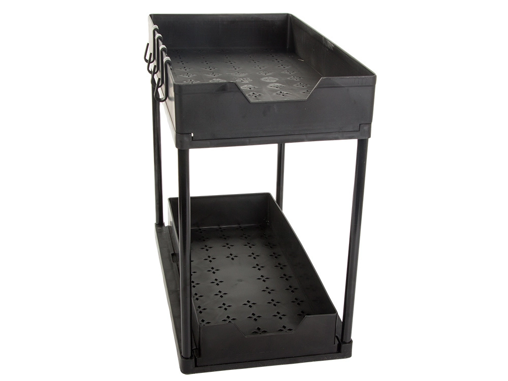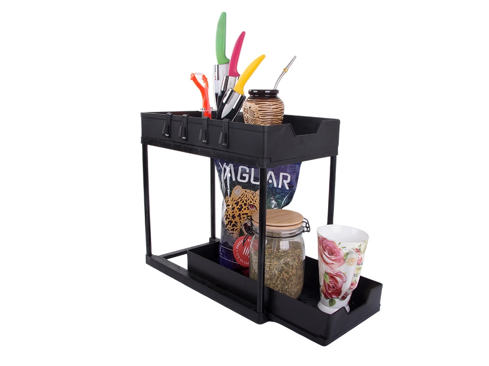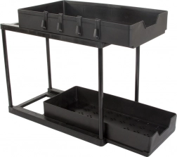 Il meccanismo scorrevole di entrambi i livelli consente di raggiungere comodamente ogni barattolo o accessorio senza dover riordinare l’intero supporto.