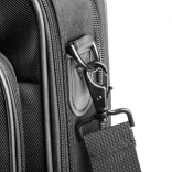 Lo spazio interno è studiato in ogni dettaglio: lo scomparto principale con X‑Holding System fissa in sicurezza il notebook, le tasche aggiuntive per gli accessori mantengono l’ordine e lo scomparto posteriore funge da cartella per documenti. Il vano anteriore offre un organizer per piccoli oggetti e una tasca con zip. Per spostamenti agevoli in aeroporto o in stazione è presente il trolley strap; la tracolla ha un cuscinetto regolabile per maggiore comfort.