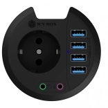 L’hub da incasso ICY BOX trasforma il passacavi standard da 80 mm in un centro funzionale di alimentazione e dati. Le quattro porte USB 3.2 Gen 1 (Type‑A) assicurano sincronizzazione rapida e connessione stabile delle periferiche, mentre la coppia di connettori audio da 3,5 mm facilita il collegamento di cuffie, headset o microfono con suono pulito.