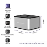 Docking station universale per 2× HDD/SSD nei formati 2.5" e 3.5" con collegamento semplice tramite USB 3.0 fino a 5 Gbps e supporto SATA I/II/III. Consente la clonazione offline con un solo tocco senza computer, offre funzione Plug & Play senza installazione di driver e un design stabile con piedini in gomma.