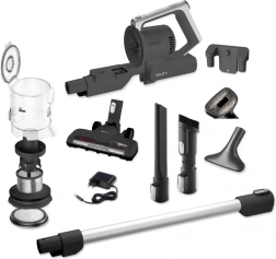 In dotazione bocchetta PET speciale per i peli degli animali, bocchetta per SOFA (imbottiti), accessori per fessure e accessorio per libri e superfici delicate. Il supporto a parete facilita il riponimento dell’aspirapolvere e degli accessori, mentre la protezione della batteria contro il surriscaldamento e il filtro premotore prolungano la vita del dispositivo.