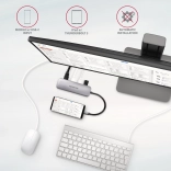 Questo hub offre tre porte USB con connettori USB-A standard. Permette il supporto permanente di diversi dischi esterni. Grazie all'interfaccia USB 3.2 Gen 1 rapida, il trasferimento dati è supportato a velocità fino a 5 Gb/s. L'hub offre anche la funzione di ricarica per telefoni e tablet con corrente fino a 1,5 A / 5 V.