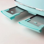 Il tostapane HERITAGE turchese in acciaio inox è la scelta ideale per tostare pane e prodotti da forno in modo rapido e uniforme. Grazie alle quattro fessure larghe è possibile inserire comodamente fette più spesse o bagel, mentre la funzione di centratura assicura una doratura omogenea su entrambi i lati.