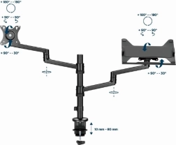 Mettete in ordine la scrivania e godetevi una seduta più sana con il braccio doppio, che sostiene facilmente un monitor da 17–32'' e un notebook fino a 17,3''. Grazie alla regolazione ergonomica di altezza, profondità e inclinazione adatterete gli schermi in pochi secondi. Gli attacchi VESA 75×75 e 100×100, la portata di 8 kg per braccio, la gestione cavi integrata e il montaggio a morsetto o tramite passacavo garantiscono stabilità e una postazione pulita.
