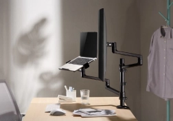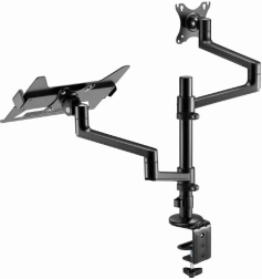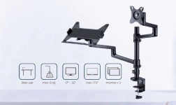 Un braccio per monitor 17–32'' (VESA 75×75/100×100), l'altro con piano d'appoggio per notebook fino a 17,3''. Risparmiate spazio e ottenete un layout di lavoro perfettamente coordinato.