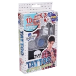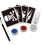 - pennello; 4 stencil (riutilizzabili); colla per tatuaggi; glitter in 3 colori; istruzioni