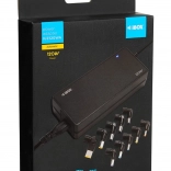 Adattatore di alimentazione universale per notebook con potenza di 120 W e regolazione automatica della corrente tramite microprocessore. Include 10 connettori intercambiabili per un'ampia compatibilità (ACER, ASUS, COMPAQ, DELL, HP, IBM, LENOVO, LG, SAMSUNG, TOSHIBA). Offre PFC attivo per il risparmio energetico e avanzati sistemi di protezione OCP/OPP/SCP/OTP per una ricarica sicura.
