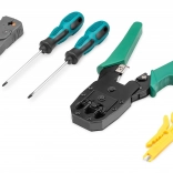 Robuste pinze crimpatrici con impugnature ergonomiche garantiscono una terminazione solida e affidabile dei cavi di rete, con taglio e spelatura integrati.