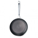 Robusta padella in acciaio inox con diametro di 28 cm, dotata di struttura a tre strati (acciaio inox 430 / alluminio / acciaio inox 304), rapida e uniforme distribuzione del calore e superficie resistente ai graffi con trama esagonale a “nido d’ape”. Adatta a tutti i tipi di piani cottura, inclusa l’induzione, forno fino a 260 °C e lavastoviglie.