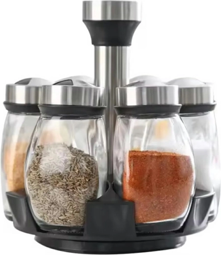 Set di 6 barattoli trasparenti per spezie con una base girevole speciale. È un elemento indispensabile dell’attrezzatura della vostra cucina. Il vetro trasparente garantisce che non avrete problemi a identificare la spezia giusta. Tutti i contenitori hanno fori ravvicinati per un dosaggio più preciso. Il set è realizzato in vetro e acciaio inox per un uso lungo e senza problemi e si inserisce perfettamente nell’arredamento di qualsiasi cucina.