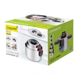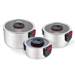Inclusi nel set ci sono tre pentole di varie dimensioni, ognuna dotata di un coperchio di vetro di qualità che ti permette di controllare facilmente il processo di cottura. Le maniglie ergonomiche pieghevoli risparmiano spazio durante la conservazione e assicurano comfort nella manipolazione. Questo set può essere usato senza problemi su piani cottura a induzione, gas, elettrici, ceramici e alogeni.