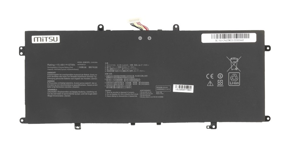 L'affidabile batteria di ricambio MITSU C41N1904 per ultrabook ASUS ZenBook e VivoBook offre una capacità reale dichiarata di 67 Wh e una tensione di 15,48 V. Utilizza celle Li‑ion di classe A, presenta basso autoscaricamento, nessun effetto memoria e avanzati sistemi di protezione contro sovraccarica, scarica profonda, sovratensione, surriscaldamento, cortocircuito e sovraccarico di corrente. Scelta ideale per lavorare più a lungo in viaggio e ripristinare l’autonomia del tuo notebook.