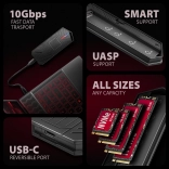 La stilosa custodia da gaming AXAGON per unità M.2 offre compatibilità universale con SSD NVMe (PCIe) e SATA (AHCI). La doppia dotazione di cavi (USB‑C–USB‑C e USB‑C–USB‑A) garantisce collegamenti semplici a notebook, PC e dispositivi mobili. USB 3.2 Gen 2 consente una banda teorica di 10 Gb/s e velocità reali fino a circa 1.000 MB/s.