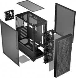 Airflow massimo senza compromessi: I pannelli frontale, superiore e laterali sono perforati, garantendo un flusso d’aria continuo e un’efficiente dissipazione del calore da CPU e GPU. Le quattro ventole da 120 mm installate di fabbrica (3× frontali, 1× posteriore) mantengono i componenti a temperature ottimali anche sotto carico.