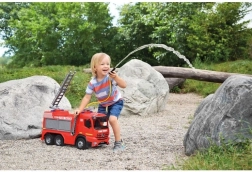 Il suo punto di forza è il cannone ad acqua con pompa a leva e serbatoio da 1,5 litri. Il cannone può essere posizionato a scelta sul tetto o sulla scala e spruzza acqua fino a 8 metri di distanza. Non manca la scala estensibile per interventi ancora più realistici.