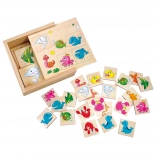 Bino Gioco di memoria in legno Mondo Acquatico offre immagini vivaci di adorabili creature acquatiche, rendendo il gioco divertente e intuitivo. Questo gioco di memoria è confezionato praticamente in una scatola con coperchio scorrevole, realizzata in legno compensato leggero e resistente.