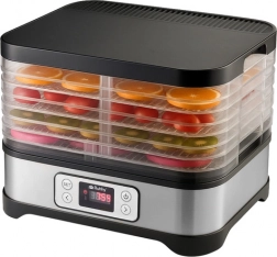Essiccatore universale Ruhhy con potenza di 400 W consente l'essiccazione facile di funghi, frutta, verdura e erbe aromatiche. È dotato di 5 vassoi con una capacità totale di 10 litri, temperatura regolabile (35–70°C) e un display leggibile con timer fino a 24 ore. Scelta ideale per la conservazione casalinga durante tutto l'anno.
