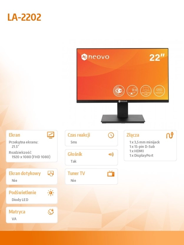 Goditi una visualizzazione di qualità su un monitor da 22 pollici con diverse opzioni di connessione. Questo monitor è una soluzione eccellente per chi cerca affidabilità e flessibilità.