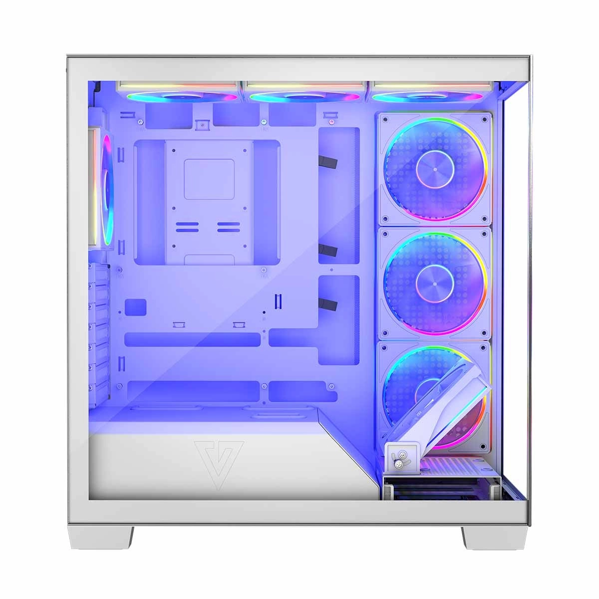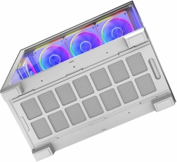 Un elemento importante è il sistema di raffreddamento efficiente, costituito da tre ventilatori ARGB laterali, altri tre sulla parte superiore e due sul retro. È disponibile anche un telaio speciale per ventilatori per il raffreddamento diretto della scheda grafica.