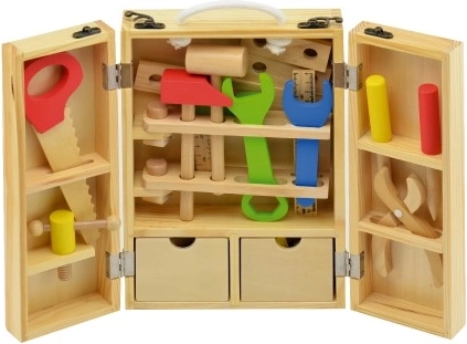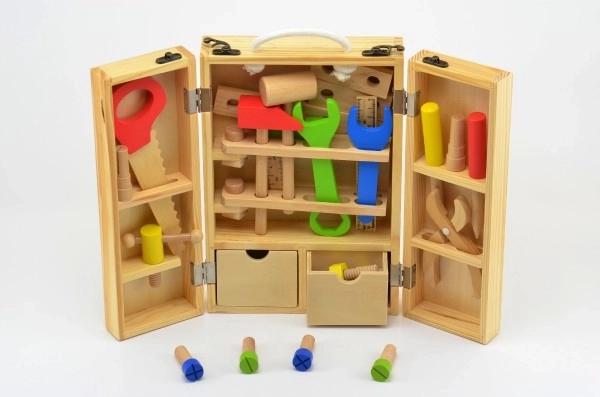 Attrezzi in legno per bambini in una pratica valigetta! Un set fantastico per piccoli artigiani che sviluppa la motricità e la creatività.