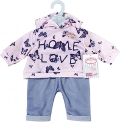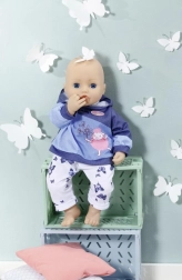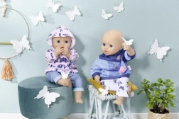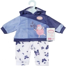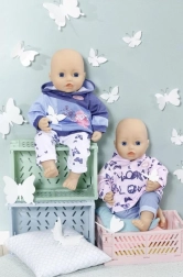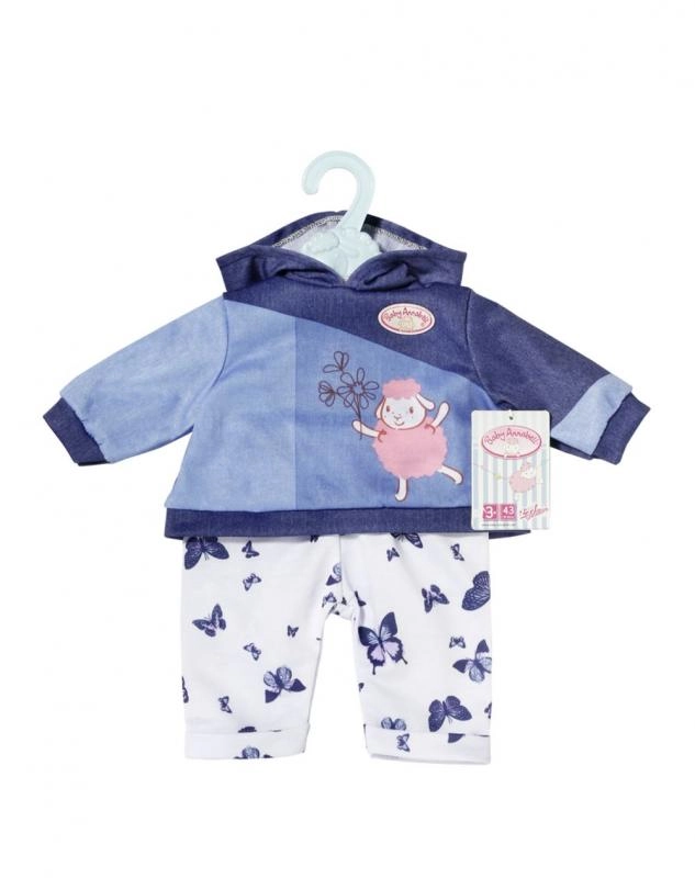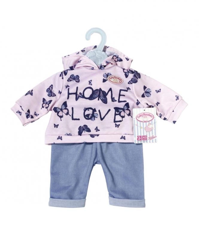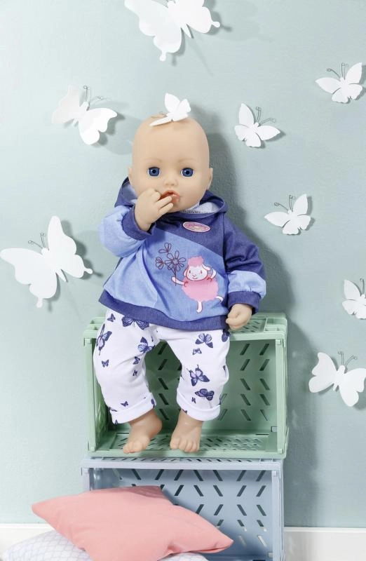 Regala alla tua bambola BABY ANNABELL un outfit comodo per la casa. Il set offre due look diversi: felpa rosa con cappuccio con delicate farfalle e pantaloni in stile jeans, oppure felpa blu con cappuccio con una graziosa stampa e comodi pantaloni sportivi. I materiali sono morbidi e piacevoli al tatto, ideali per il gioco quotidiano.