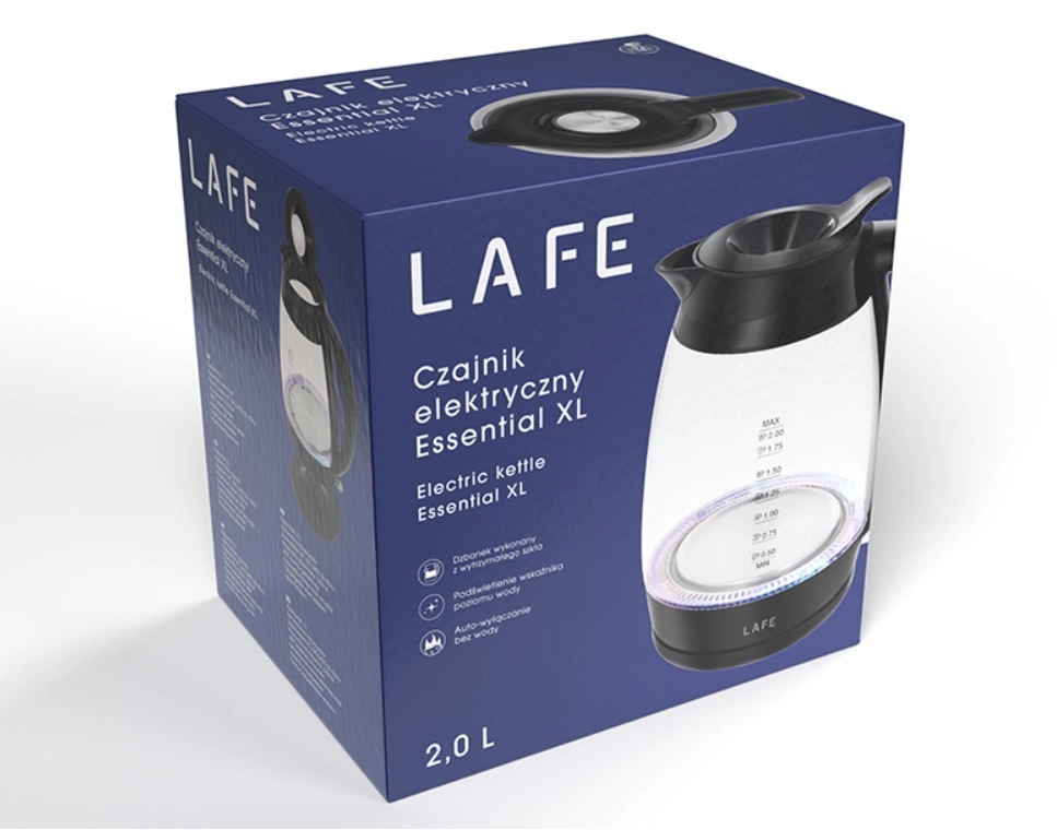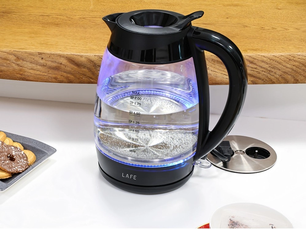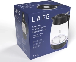 Elegante e pratico bollitore elettrico LAFE Essential XL con capacità di 2 litri, offre ebollizione rapida, caraffa in vetro trasparente e illuminazione LED blu. Dispone di potenza 2200 W, spegnimento automatico e protezione in caso di mancanza d’acqua – ideale per casa e ufficio.