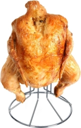 Il pratico supporto per arrostire il pollo garantisce una cottura uniforme e una pelle bella croccante. Grazie alla posizione verticale, la carne non giace nel grasso, quindi è più sana, succosa all'interno e croccante all'esterno. La robusta struttura in filo cromato e la base stabile facilitano un uso sicuro in ogni cucina.