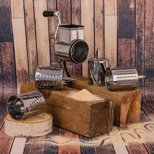 Grattugia manuale universale in acciaio inox con solido morsetto da tavolo e cinque tamburi intercambiabili per diversi tipi di grattugia e affettatura. Ideale per formaggio, noci, cioccolato, frutta e verdura. Grazie al fissaggio stabile e alla manovella comoda prepari ingredienti freschi in modo rapido e senza sforzo. Finitura di qualità e facile manutenzione garantiscono una lunga durata.