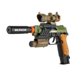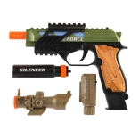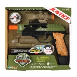 Pistola di plastica dall’aspetto realistico per piccoli appassionati di giochi d’azione. Offre effetti luminosi, effetti sonori e pratici accessori come mirino, torcia e silenziatore. Funziona con batterie, incluse nella confezione.