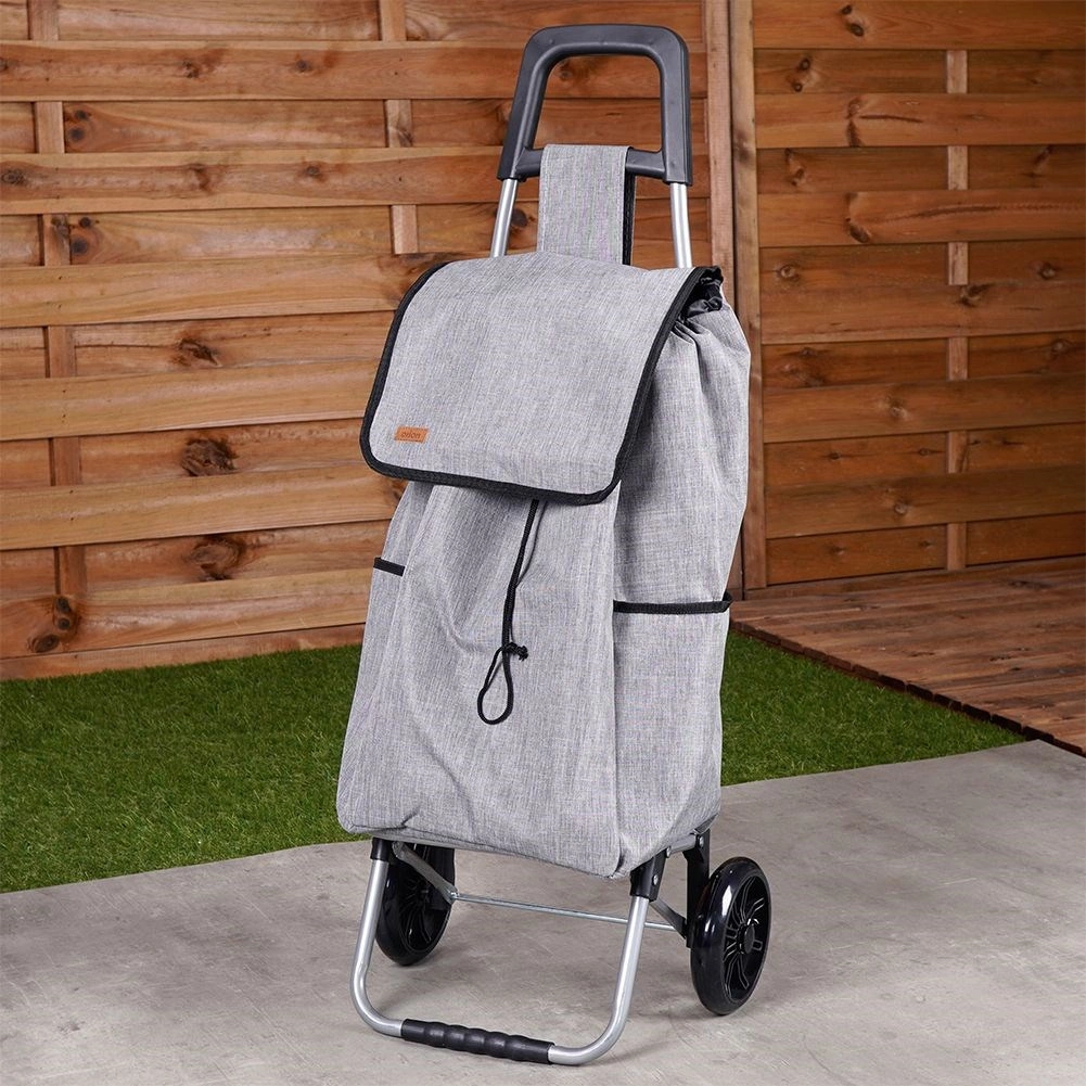 Il carrello per la spesa con borsa in tessuto grigia è progettato per trasportare gli acquisti in modo comodo e sicuro. Il telaio in metallo leggero ma resistente con due grandi ruote in plastica assicura stabilità e scorrevolezza. La borsa è protetta da una patta e si chiude con una cordicella, così il contenuto rimane al sicuro anche con il maltempo.