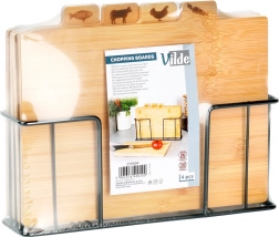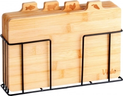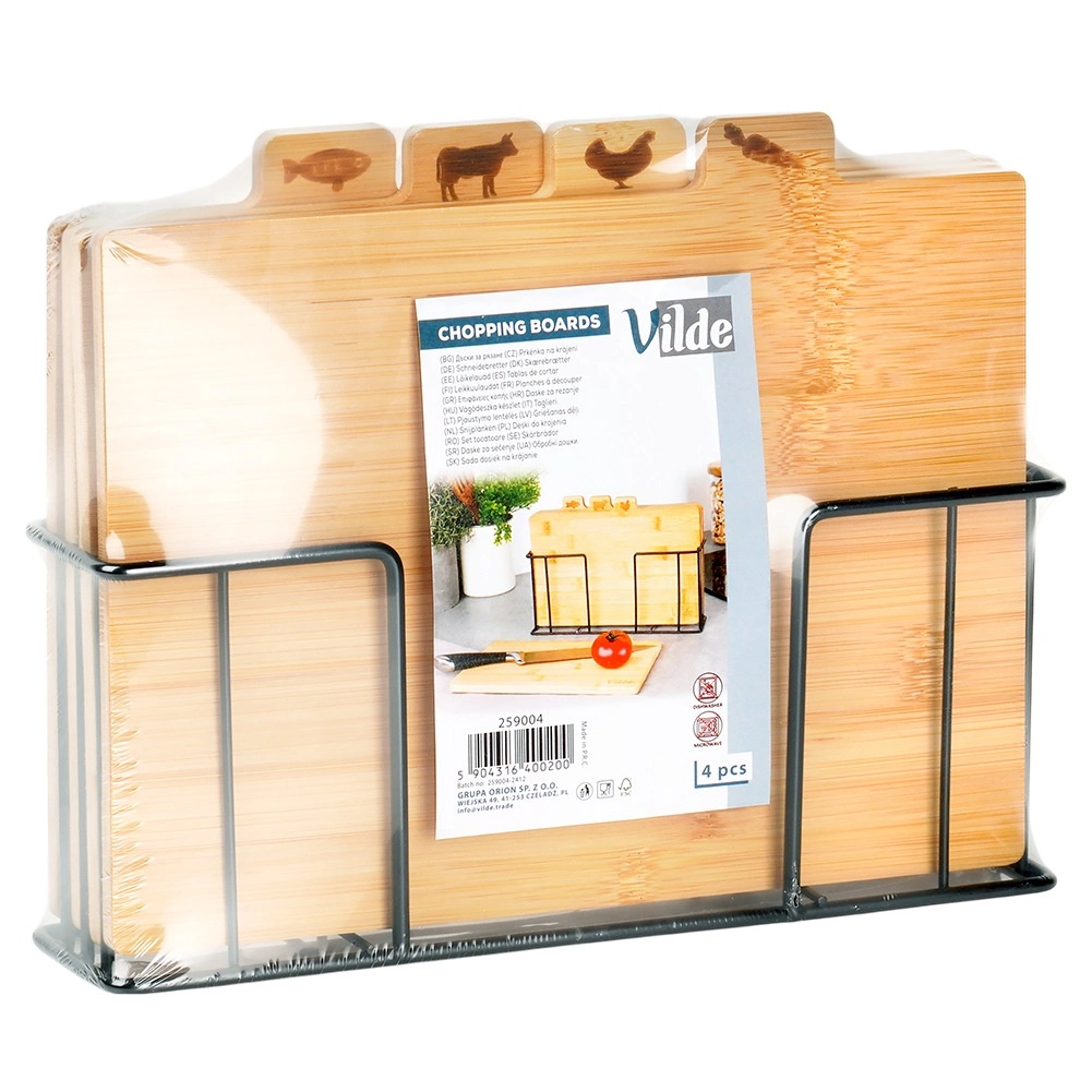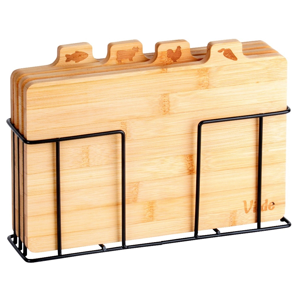 Pratico set di quattro taglieri da cucina in 100% bambù con supporto in metallo per una sistemazione ordinata. Ogni tagliere ha una icona per un alimento specifico (verdura, pollame, carne, pesce) per un taglio igienico senza contaminazione incrociata. Il bambù è resistente all'umidità, asciuga rapidamente e non assorbe gli odori.