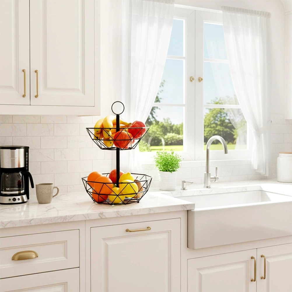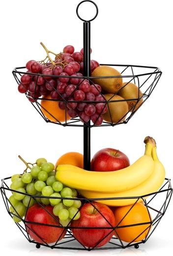 Il cestino a rete a due livelli è una soluzione eccellente per una conservazione ordinata e igienica di frutta, verdura e piccoli oggetti in cucina o in sala da pranzo. La struttura aperta favorisce la circolazione dell’aria, mantenendo la frutta più a lungo fresca, mentre la disposizione verticale fa risparmiare prezioso spazio sul piano di lavoro.