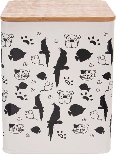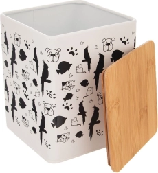 Elegante contenitore in metallo da 3 l che mantiene crocchette e snack più a lungo freschi. Ha dimensioni compatte 14 × 14 × 17 cm, coperchio in bambù con guarnizione in silicone per una chiusura ermetica perfetta, è resistente, pratico e, grazie al motivo animale, anche un elemento decorativo della tua cucina.