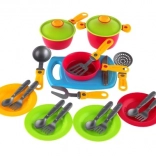 Questo set colorato di stoviglie con tagliere è perfetto per le cucine giocattolo e i giochi di cucina. La plastica leggera ma robusta garantisce un uso sicuro e duraturo, e i singoli pezzi sono comodi da impugnare per i bambini.