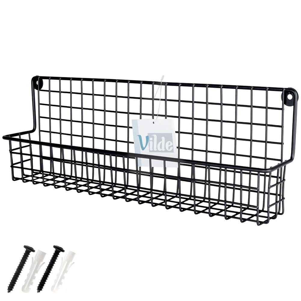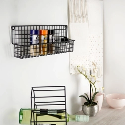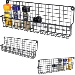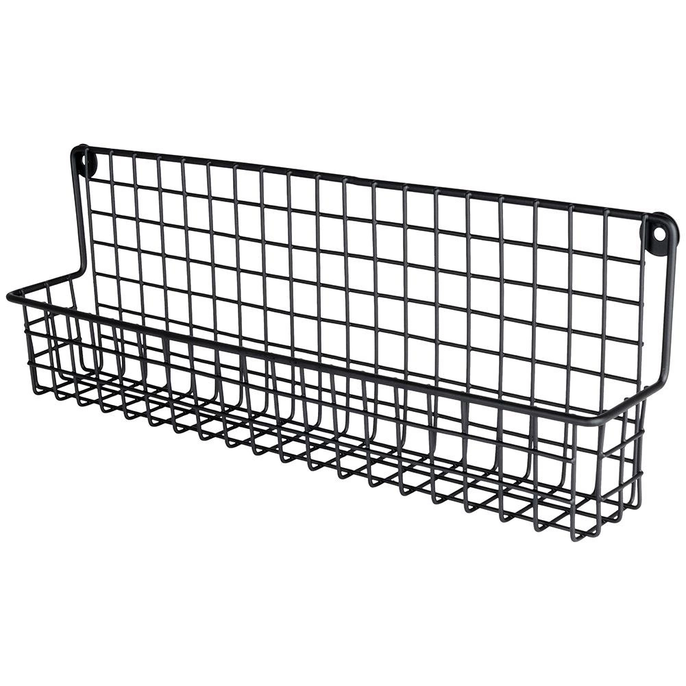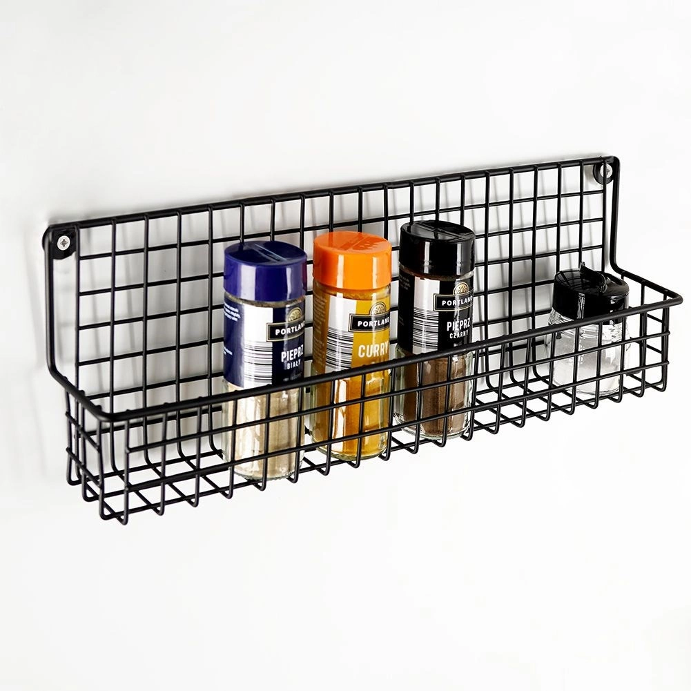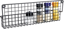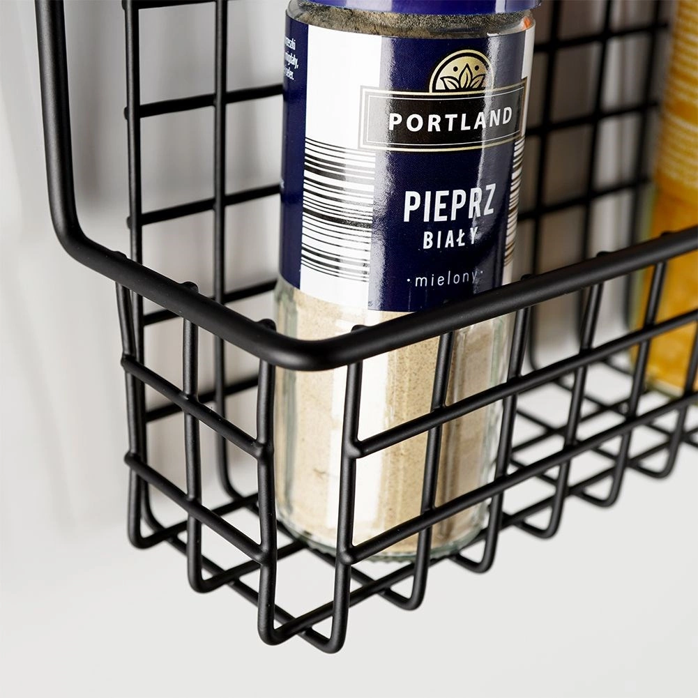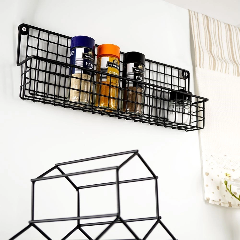 Il metallo nero resistente con cestello a filo mantiene barattoli di spezie e piccole boccette saldamente in posizione e ne facilita la sistemazione ordinata.