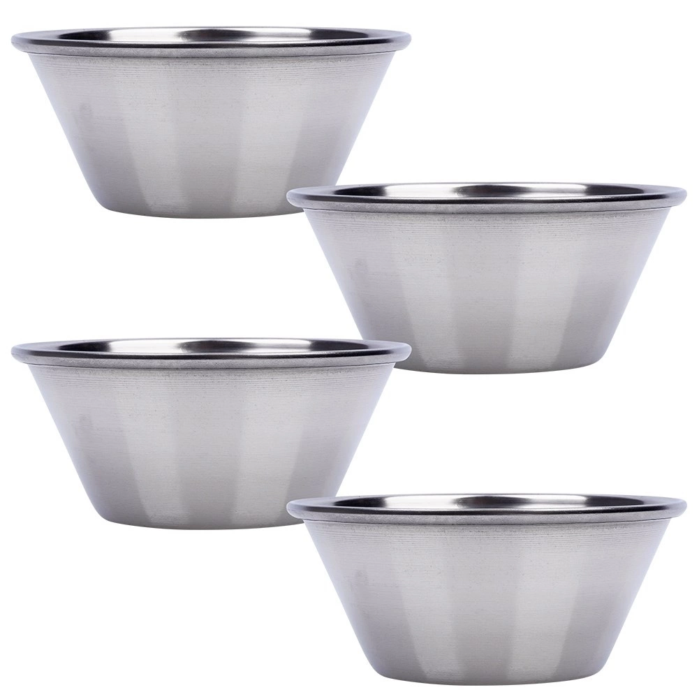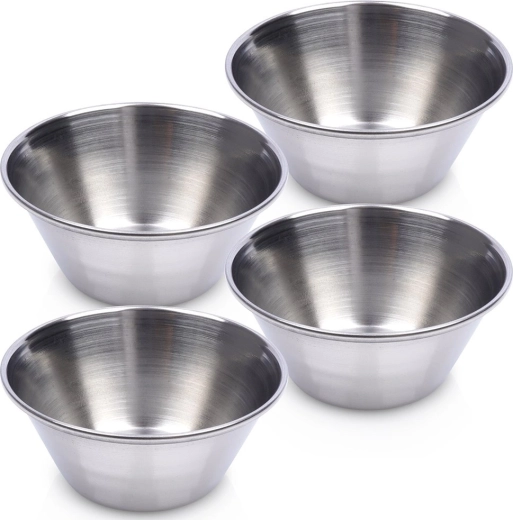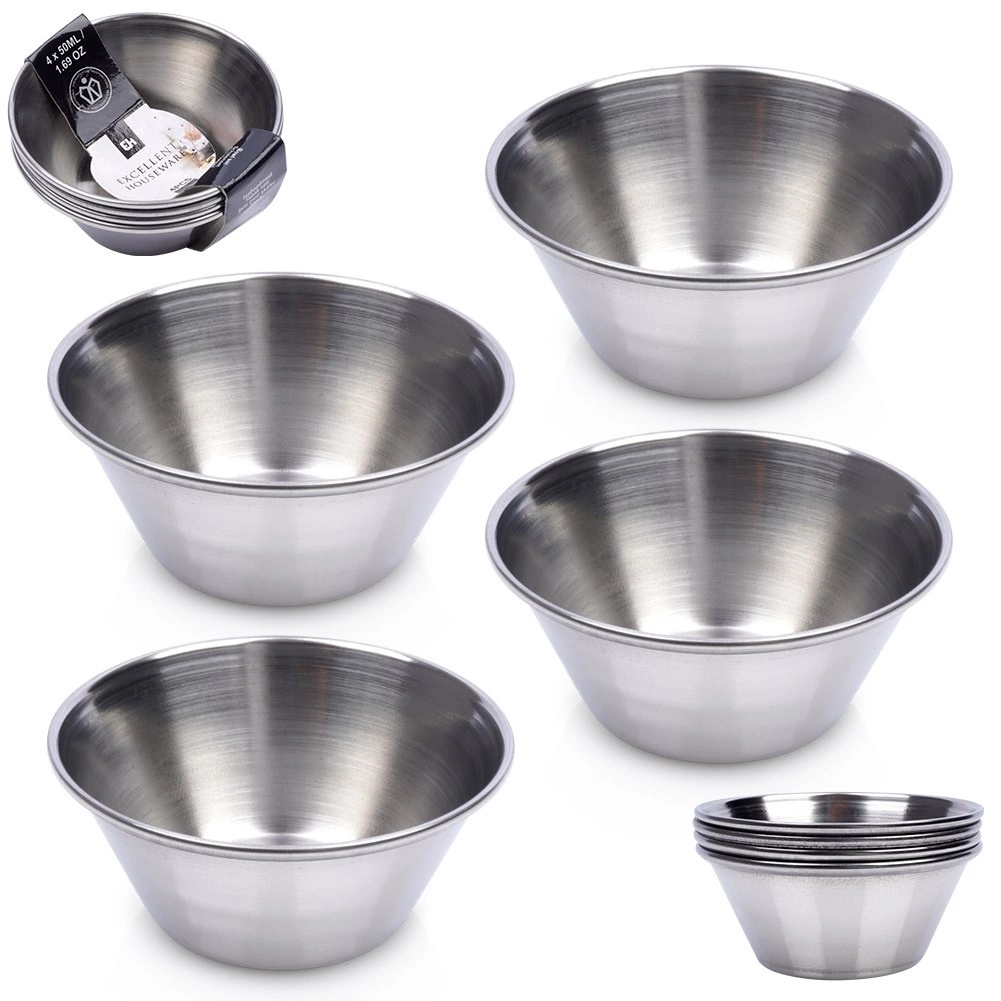 Eleganti ciotoline in acciaio inox per dip e salse in un pratico set da 4 pezzi con capacità di 40 ml e dimensioni 6 × 2,5 cm. Realizzate in acciaio inossidabile di alta qualità con esterno lucido e interno satinato, sono resistenti, igieniche e facili da pulire. Perfette per salse, dip, condimenti, spezie e anche come ciotole per la preparazione degli ingredienti.