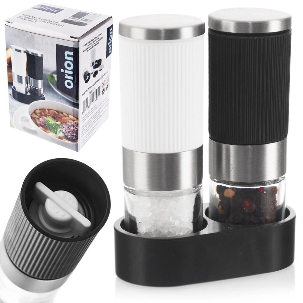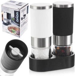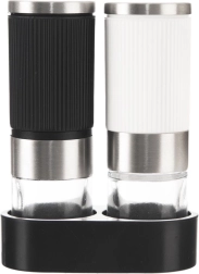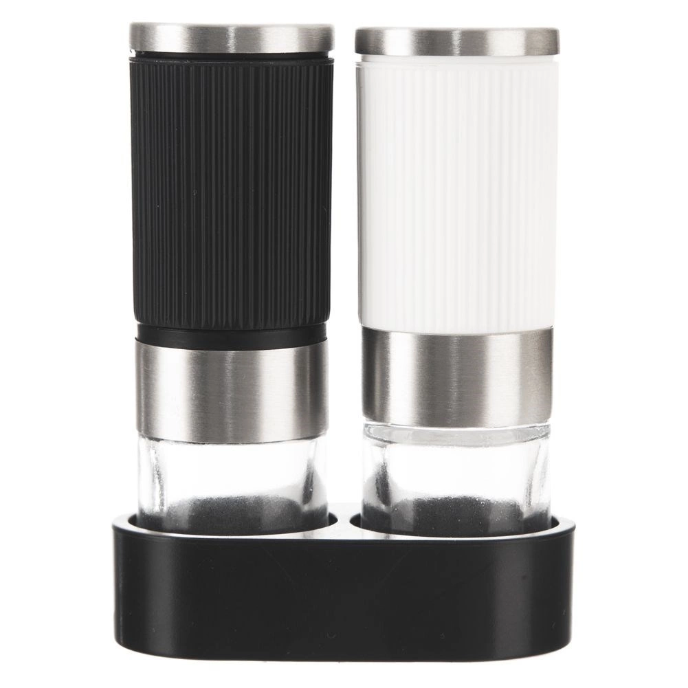 Set elegante di due macinini manuali per sale e pepe con supporto stabile, perfetto per cucine moderne e classiche. Il vetro trasparente consente di controllare le scorte, i dettagli in acciaio inox donano un look premium e il corpo zigrinato in nero e bianco assicura una presa salda anche con le mani bagnate.