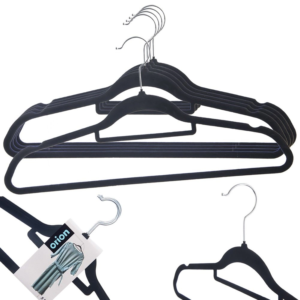 Pratico set di 5 grucce in velluto nero con superficie antiscivolo e gancio metallico rotante per un’organizzazione perfetta del guardaroba. Il profilo sottile fa risparmiare spazio, le spalle hanno incavi per spalline/bluse e l’asta inferiore è ideale per pantaloni o sciarpe. Dimensioni di un pezzo 45 × 23,5 × 0,5 cm – ideali per casa e negozi.