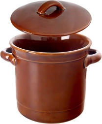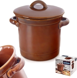 Questo contenitore in ceramica smaltata marrone di alta qualità (17 × 14 cm, altezza 12 cm, con coperchio 15 cm) è perfetto per la cucina di casa. Grazie alla ceramica impermeabile mantiene condizioni stabili per la fermentazione delle verdure, la marinatura di formaggi o salsicce, nonché per conservare lo strutto, paté o creme spalmabili.