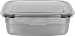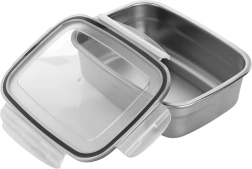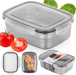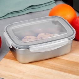 Pratico contenitore in acciaio inox con capacità di 700 ml e dimensioni 17 × 13,5 × 5,5 cm, ideale per pranzi, snack e avanzi. Il coperchio trasparente con guarnizione in silicone e quattro clip robuste assicura una chiusura ermetica e anti-perdita, mantenendo il contenuto più a lungo fresco.