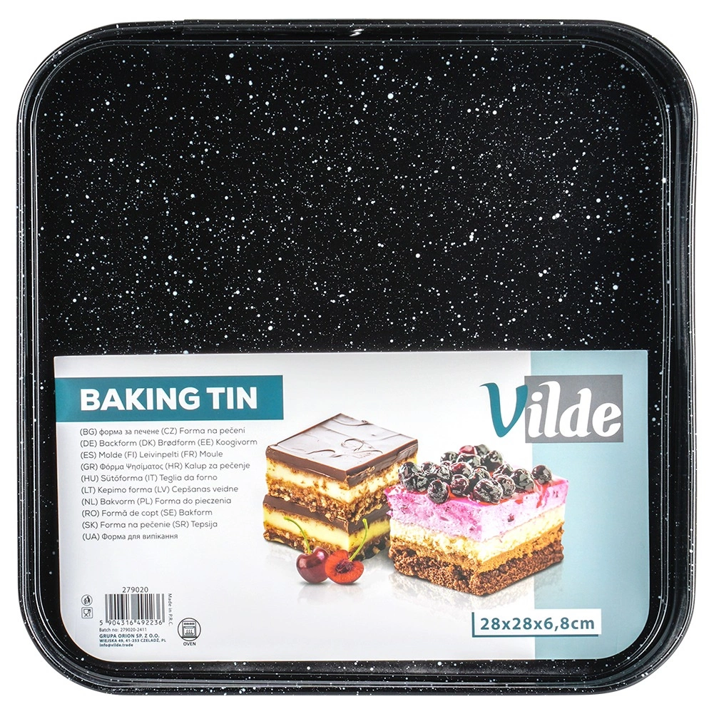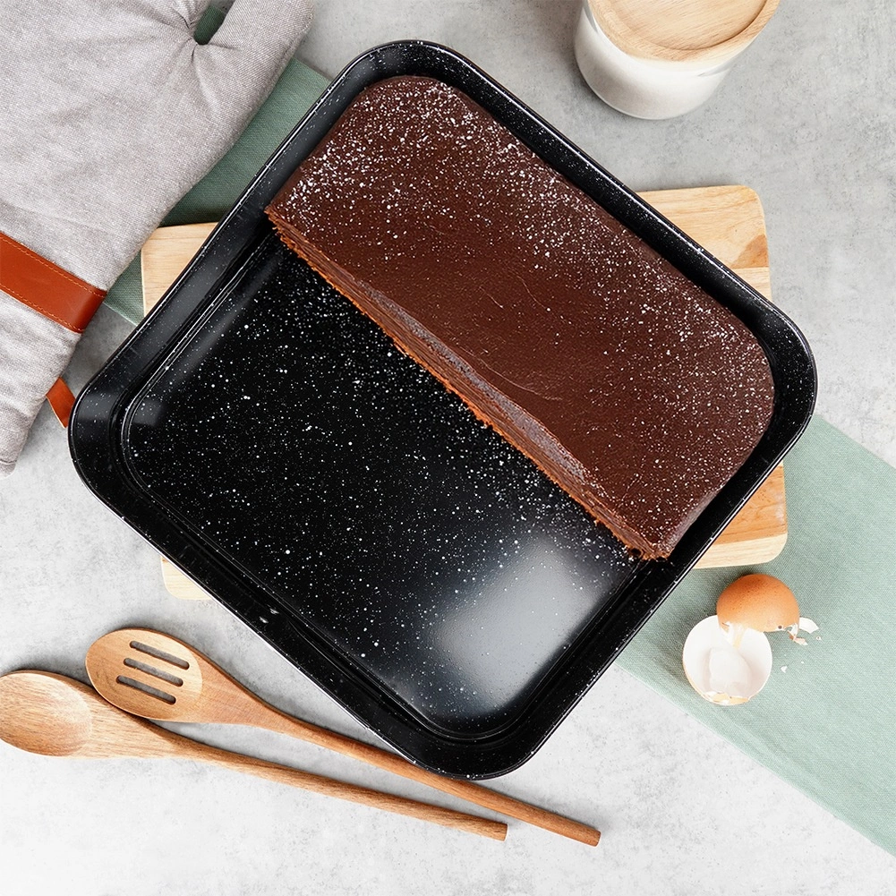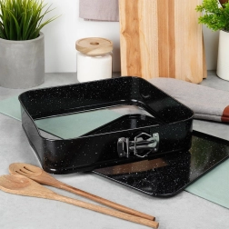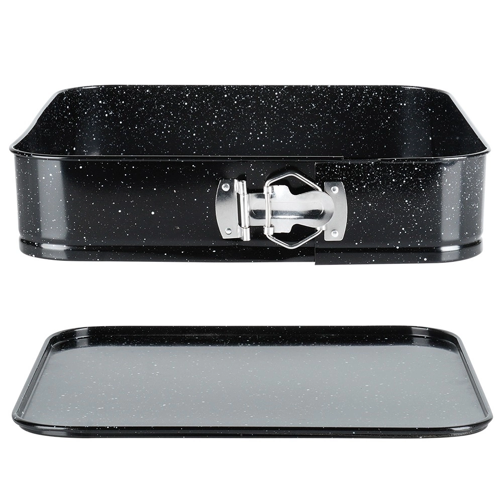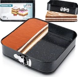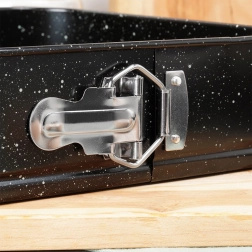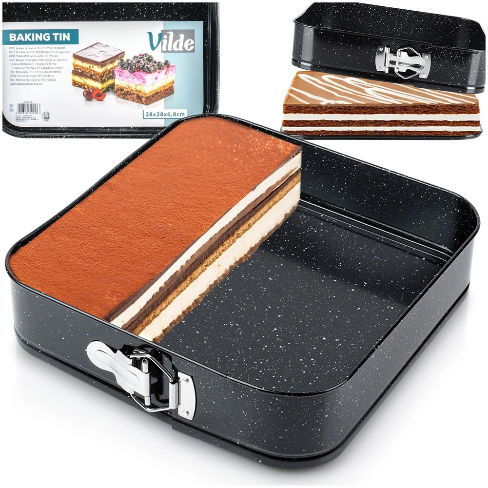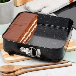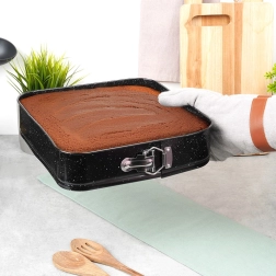 Questa teglia quadrata a cerniera 28 × 28 × 6,8 cm è un’ottima scelta per la cottura quotidiana. Il corpo in acciaio al carbonio di qualità con rivestimento effetto granito garantisce eccellente conduzione del calore e riduce le bruciature. Si apre facilmente con la clip laterale e, grazie al fondo removibile, sformi il dolce senza danneggiarne la forma.