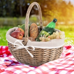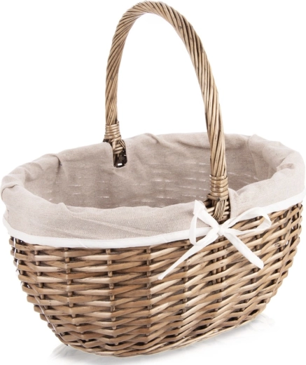 Elegante cesto da picnic in vimini con pratica maniglia e fodera in tessuto rimovibile, caratterizzato da robusta intrecciatura artigianale in vimini naturale, uso versatile e facile manutenzione. Ideale per picnic, spesa, stoccaggio e anche come cesto per funghi dopo aver rimosso la fodera.