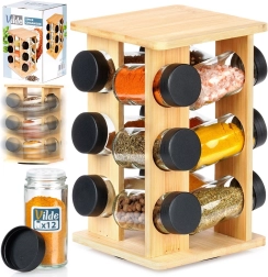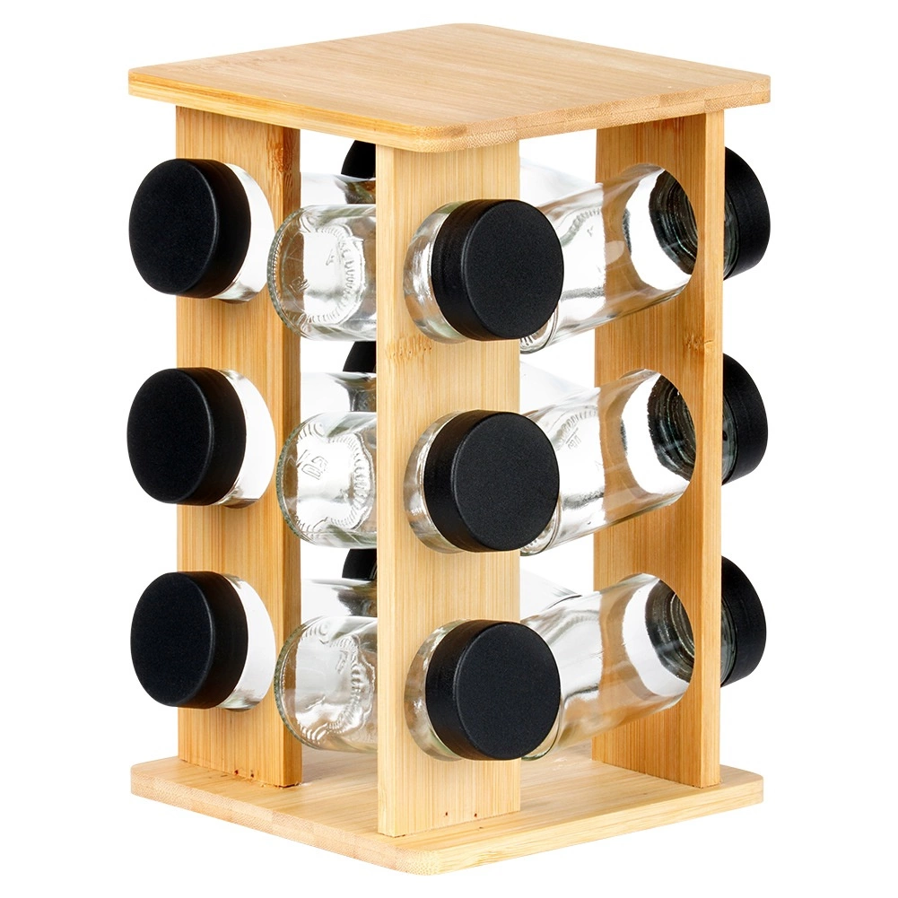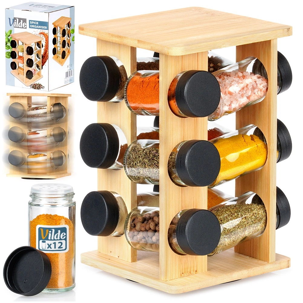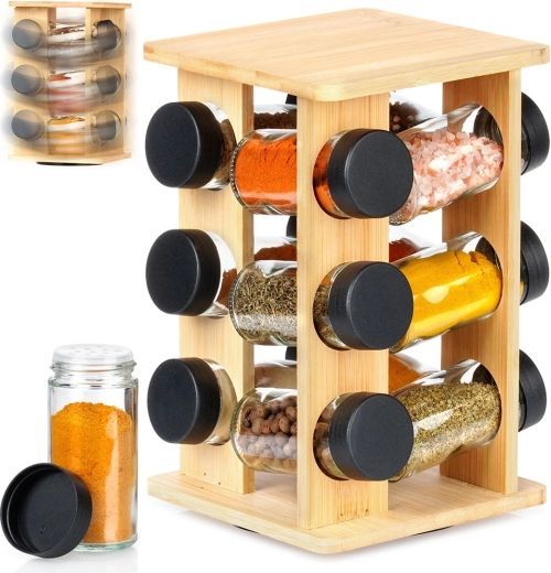 Tieni le spezie a portata di mano e perfettamente in ordine. Il supporto girevole in legno di bambù naturale ospita 12 barattoli in vetro per spezie con coperchi a vite neri e setacci bianchi per un comodo dosaggio. Grazie al meccanismo girevole trovi subito l’ingrediente desiderato, mentre la struttura verticale compatta fa risparmiare spazio sul piano di lavoro e all’interno dei pensili.