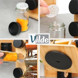 Il supporto in legno di bambù è stabile ed elegante. I barattoli in vetro trasparente con coperchi neri sono durevoli e, senza coperchi, adatti alla lavastoviglie.