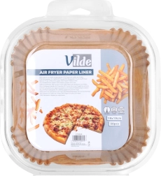 Gli inserti di carta monouso Vilde riducono i tempi di pulizia e mantengono più a lungo pulito il cestello della friggitrice. La forma quadrata con bordi increspati si adatta perfettamente ai cestelli squadrati. La base di circa 16 × 16 cm e la misura superiore 19 × 19 × 4,5 cm offrono spazio sufficiente per patatine, alette, verdure e prodotti da forno.