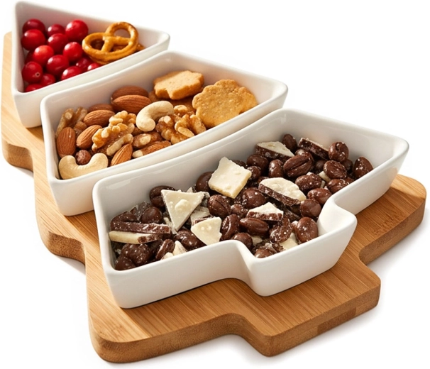 Set elegante per il servizio con ciotoline in porcellana su vassoio in bambù a forma di albero di Natale. Ideale per noci, olive, salse e antipasti durante gli incontri festivi. La porcellana bianca elegante e il bambù naturale creano un elemento decorativo e pratico per la tavola. Le ciotole sono lavabili in lavastoviglie (non il vassoio).