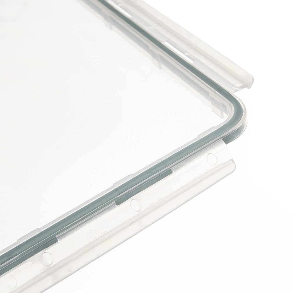 Il coperchio con 4 clip e inserto di tenuta in silicone impedisce l’ingresso di aria e umidità, così gli alimenti restano freschi più a lungo. Il contenitore è resistente nell’intervallo -20 °C fino a +100 °C, lavabile in lavastoviglie, utilizzabile nel microonde (senza coperchio), adatto a frigorifero e freezer.