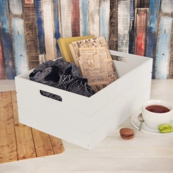 Pratica cassetta portaoggetti in legno bianca che aiuta a mantenere l’ordine in casa e in ufficio. Misura 36 × 26 × 15 cm, è realizzata in legno robusto e, grazie alle maniglie laterali, si trasporta facilmente. Perfetta per cosmetici, cancelleria, accessori per l’armadio o utensili da cucina. È universale, resistente, multifunzione e al contempo decorativa.